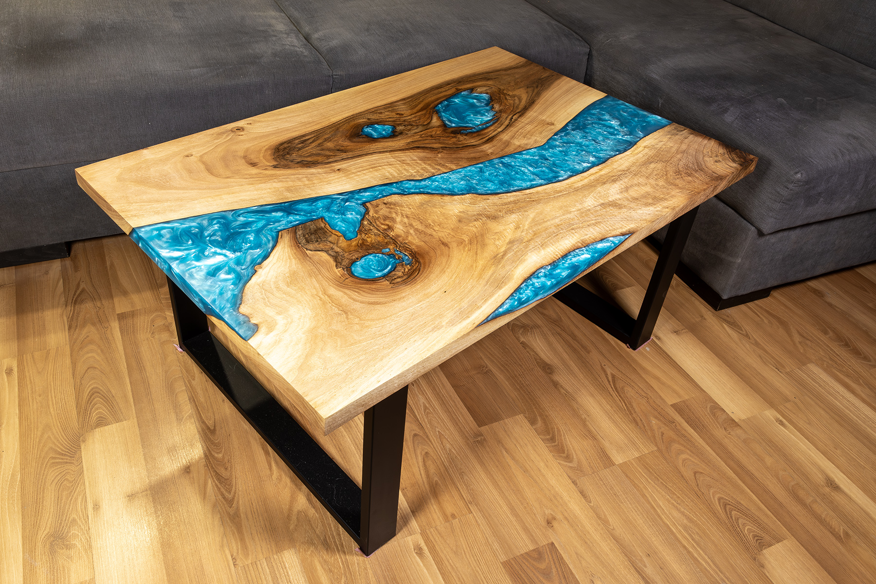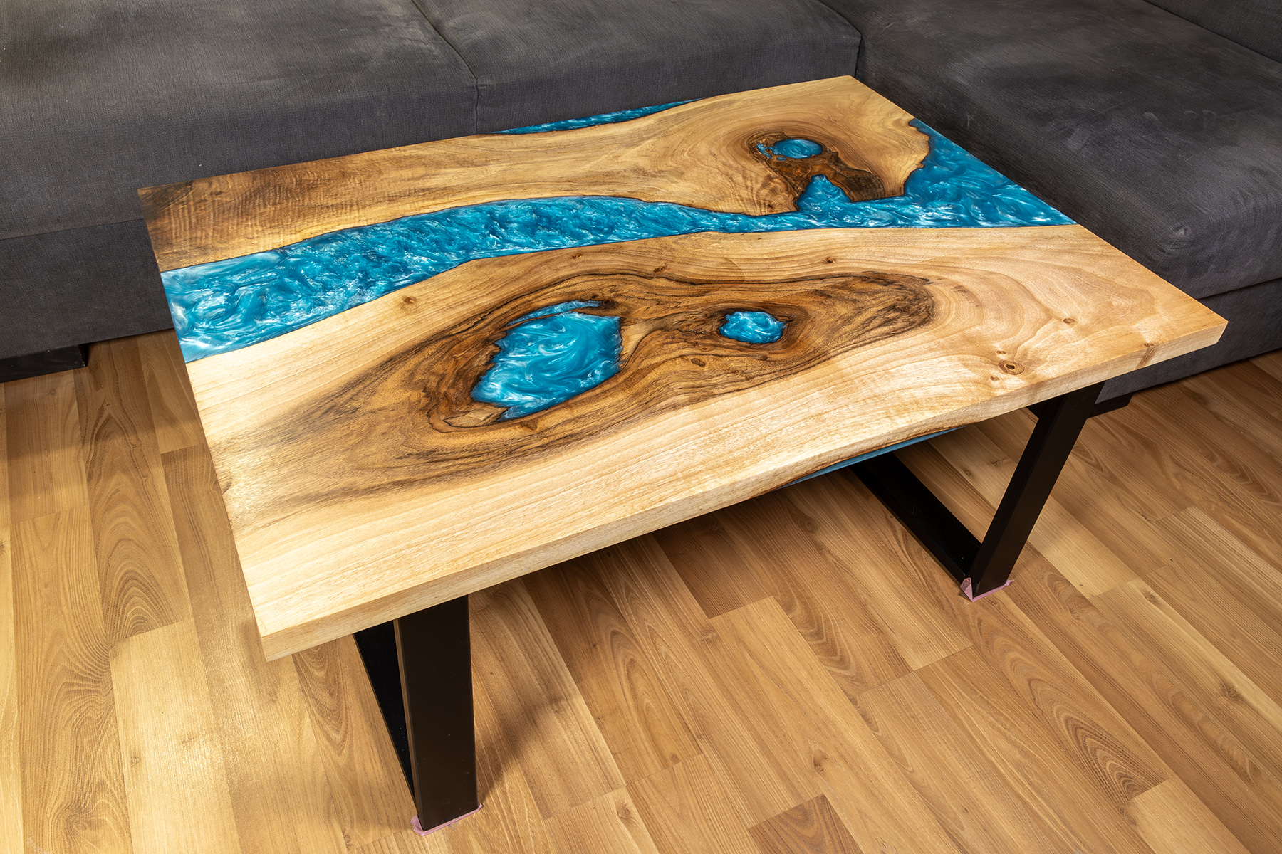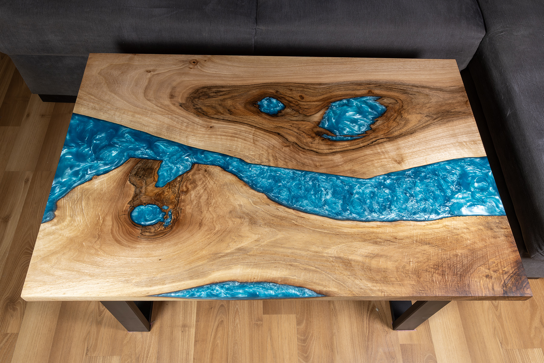 - Materiały: lite drewno orzecha włoskiego, lazurowa żywica epoksydowa