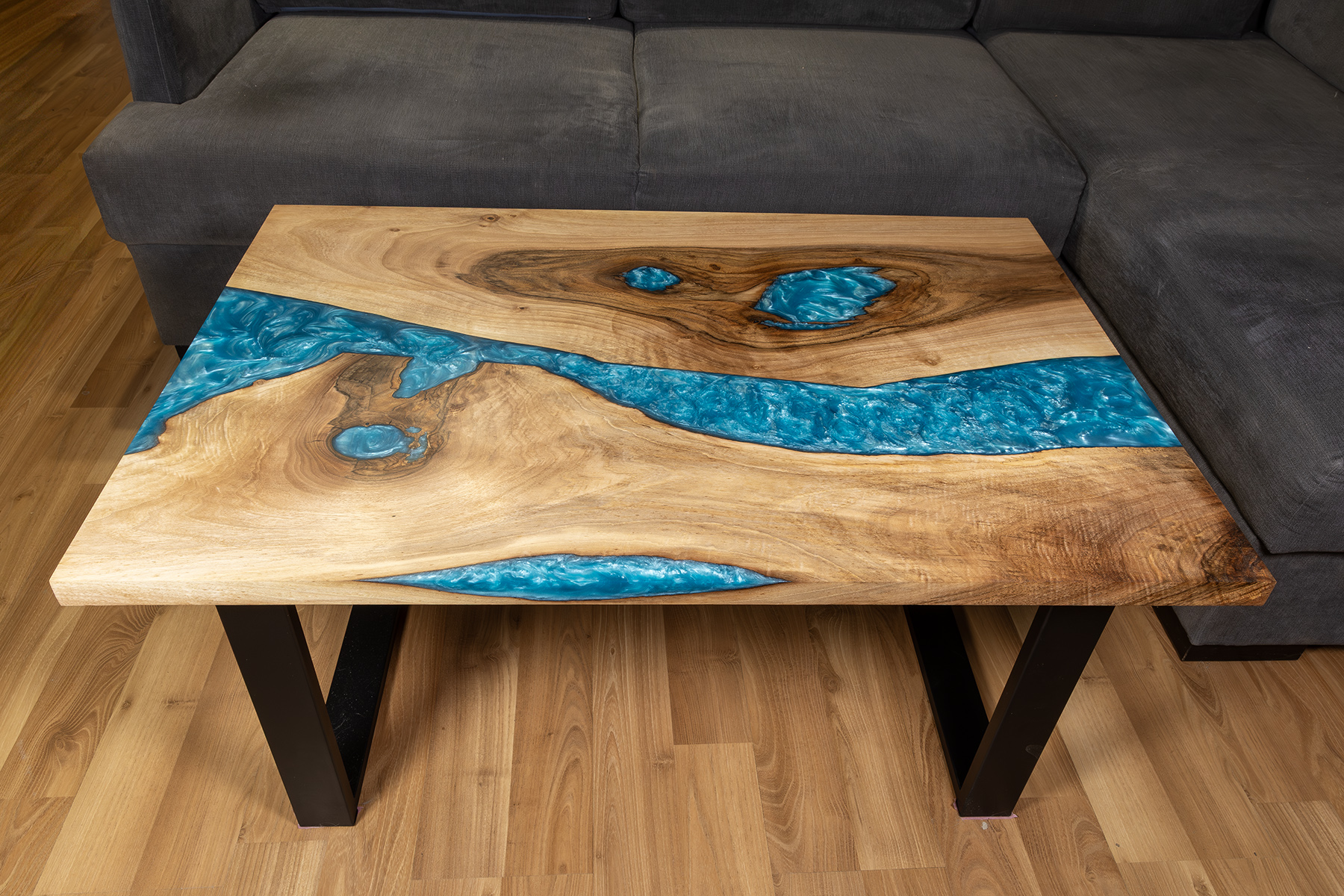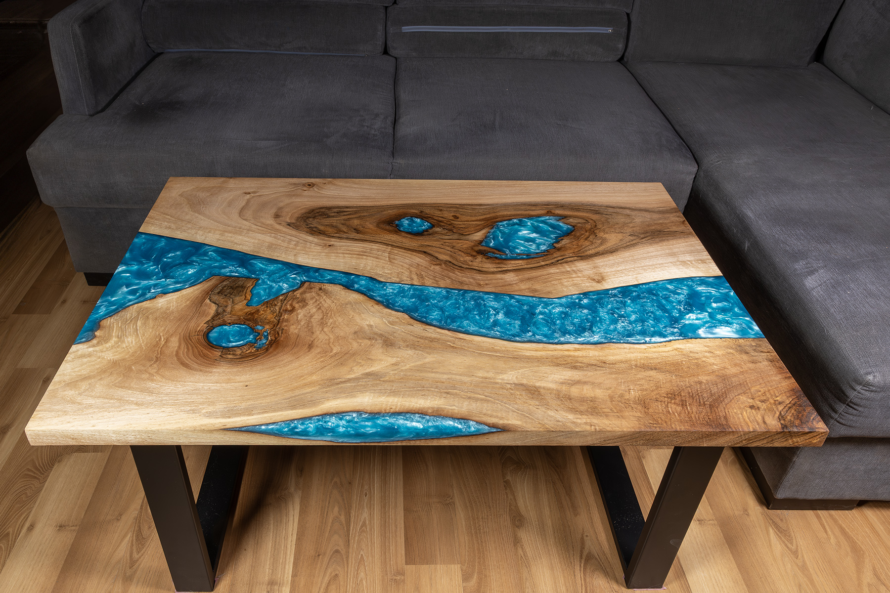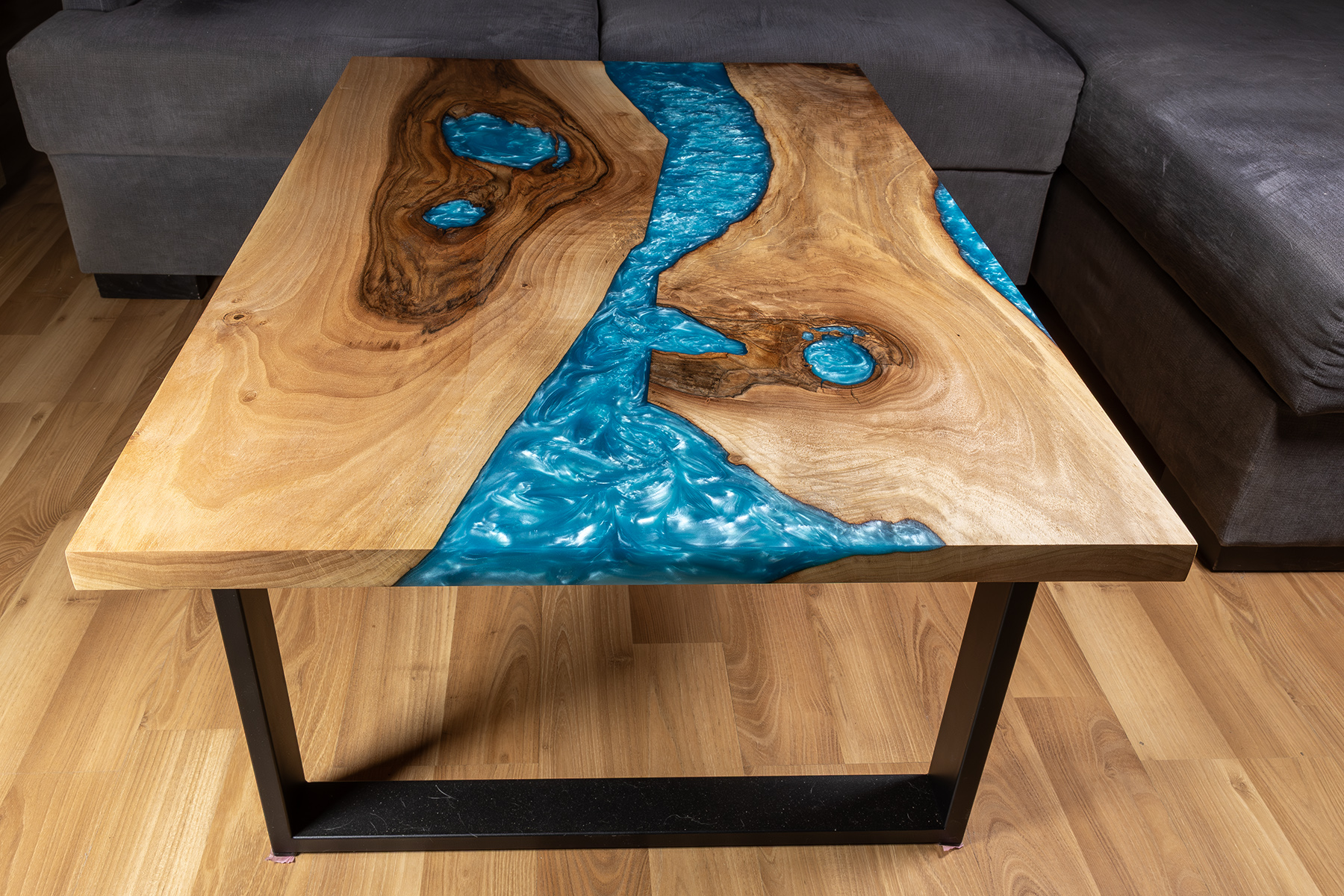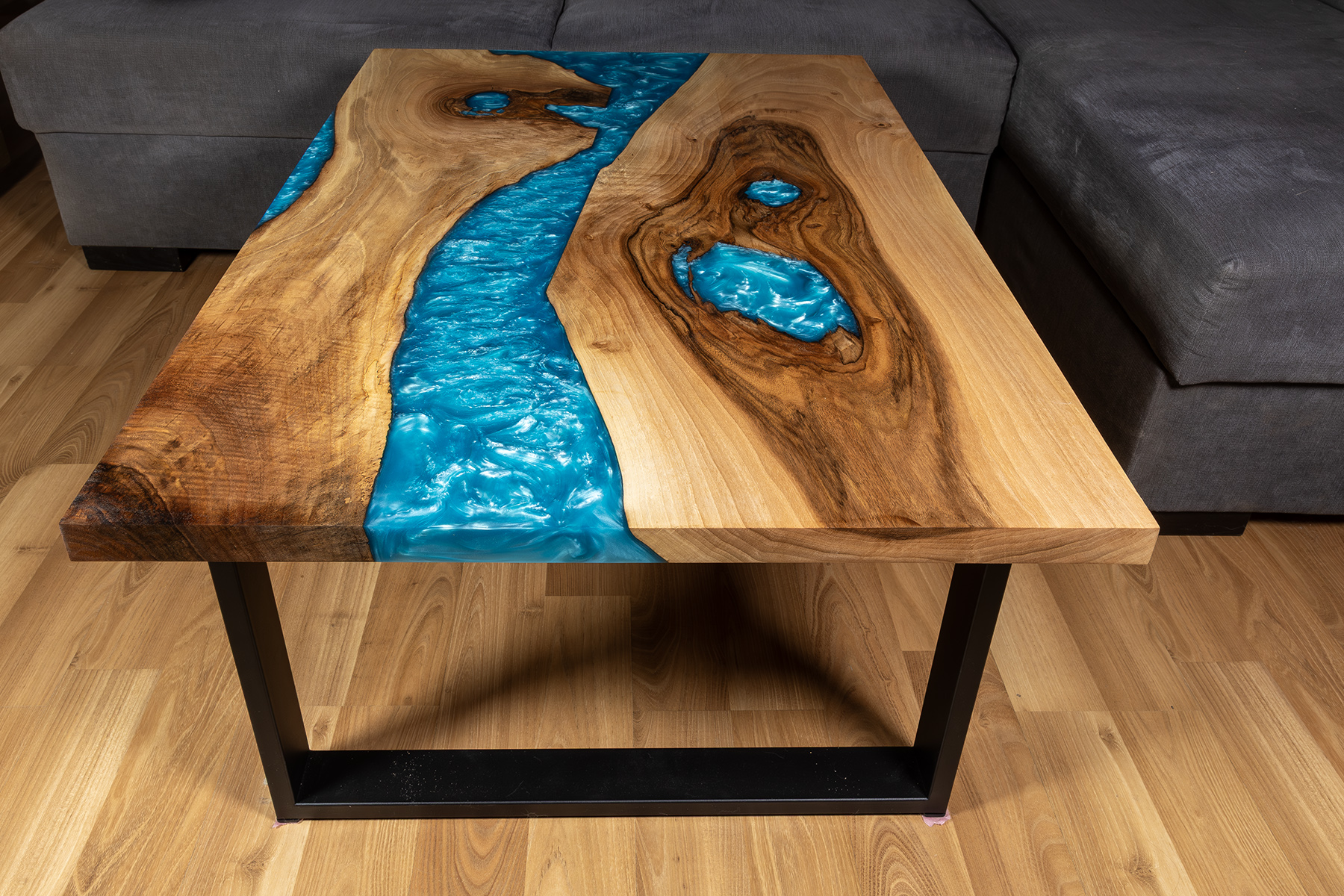 - Materiały: lite drewno orzecha włoskiego, lazurowa żywica epoksydowa