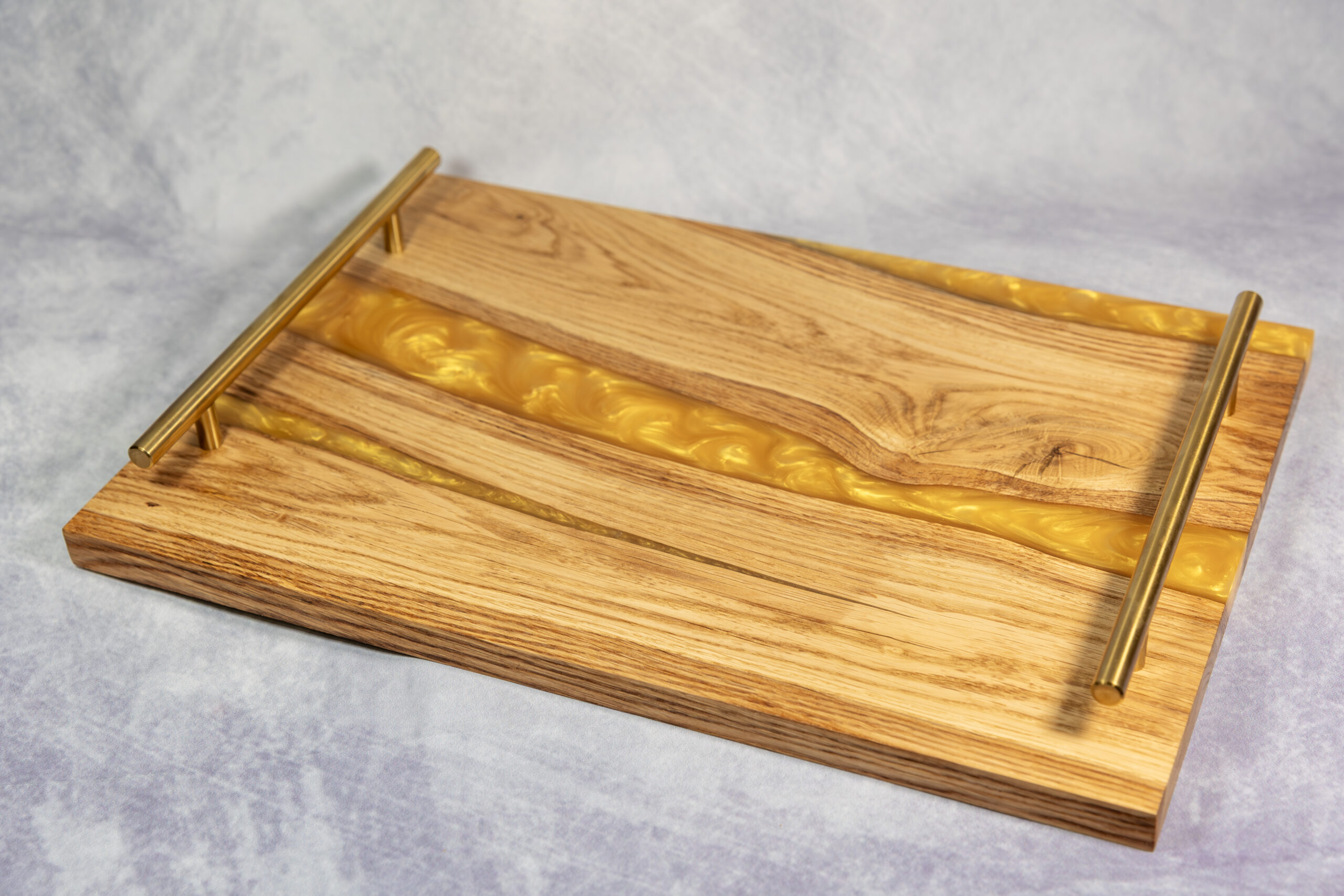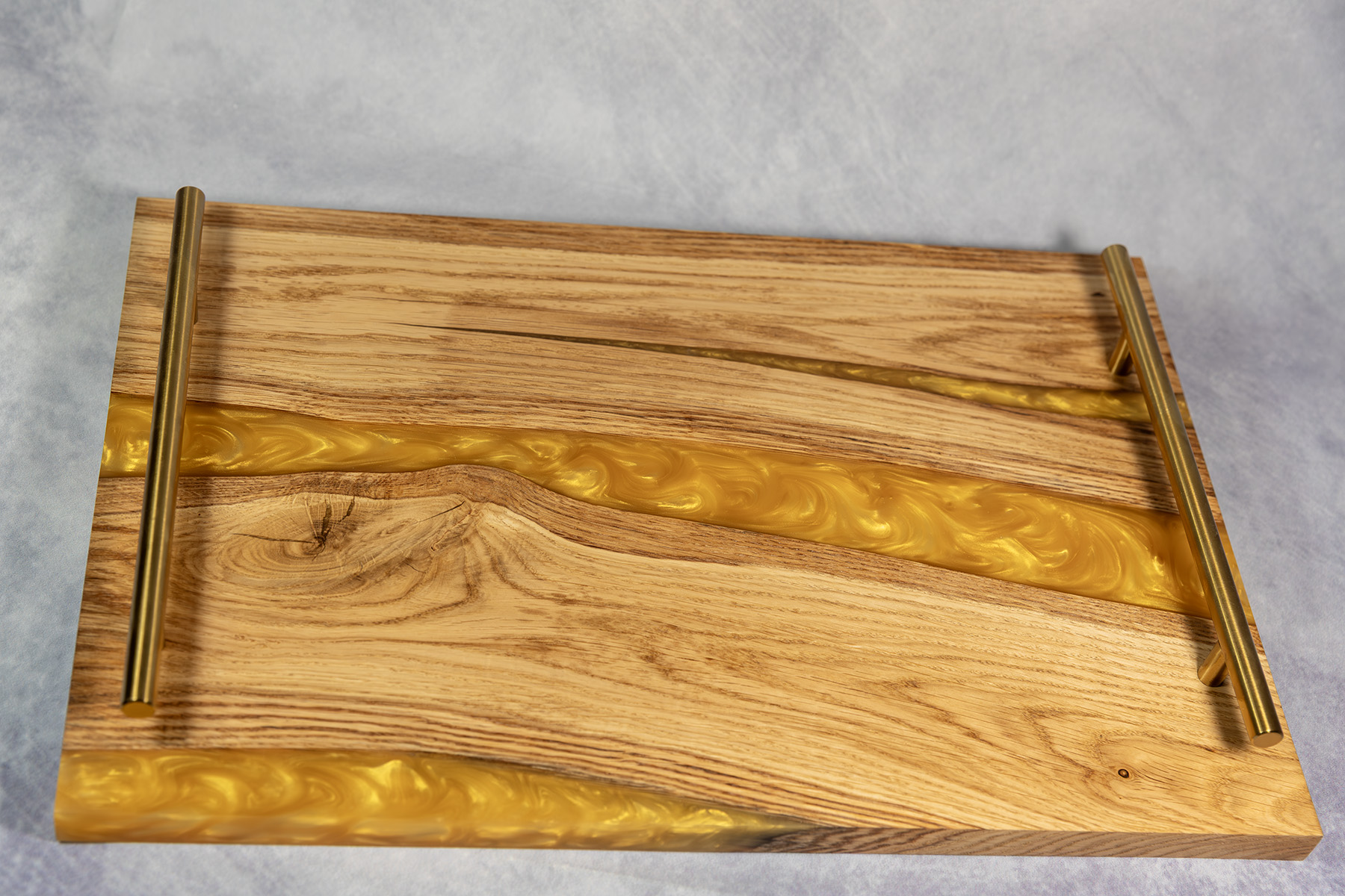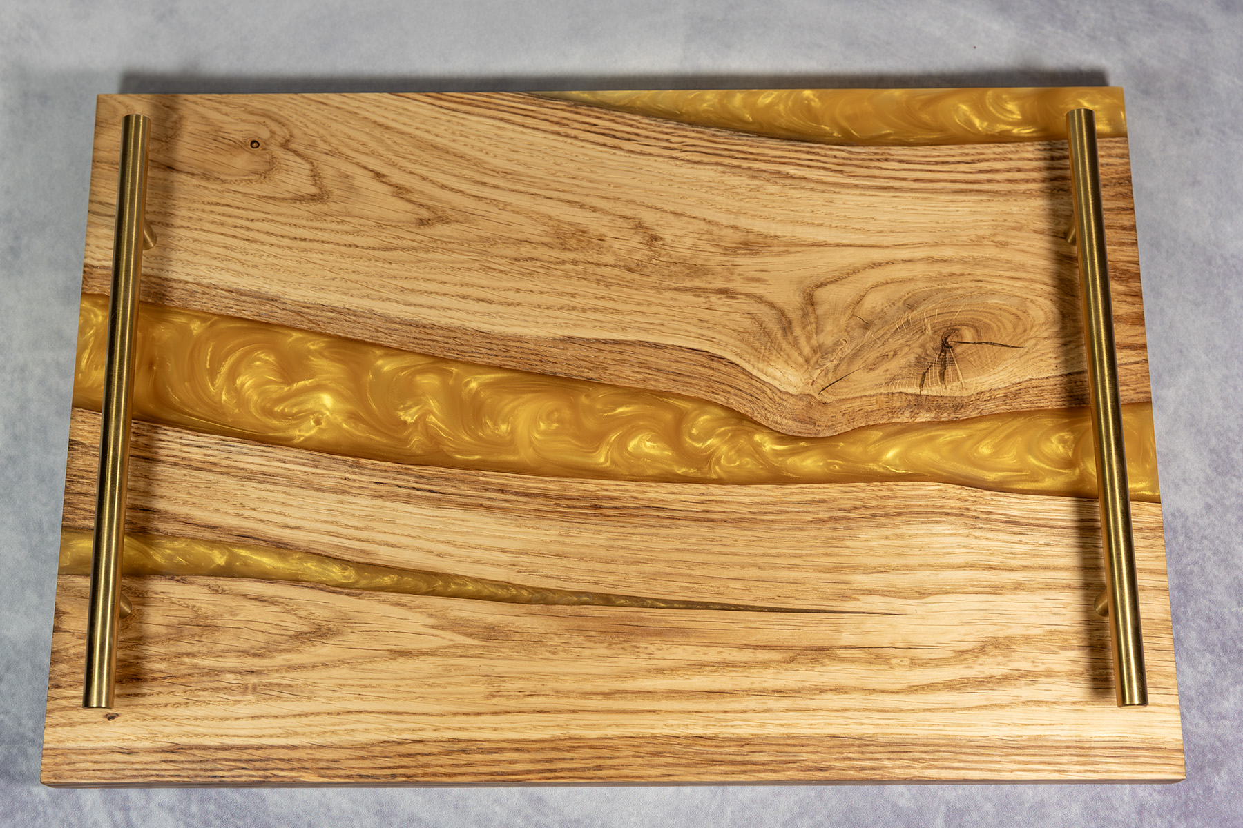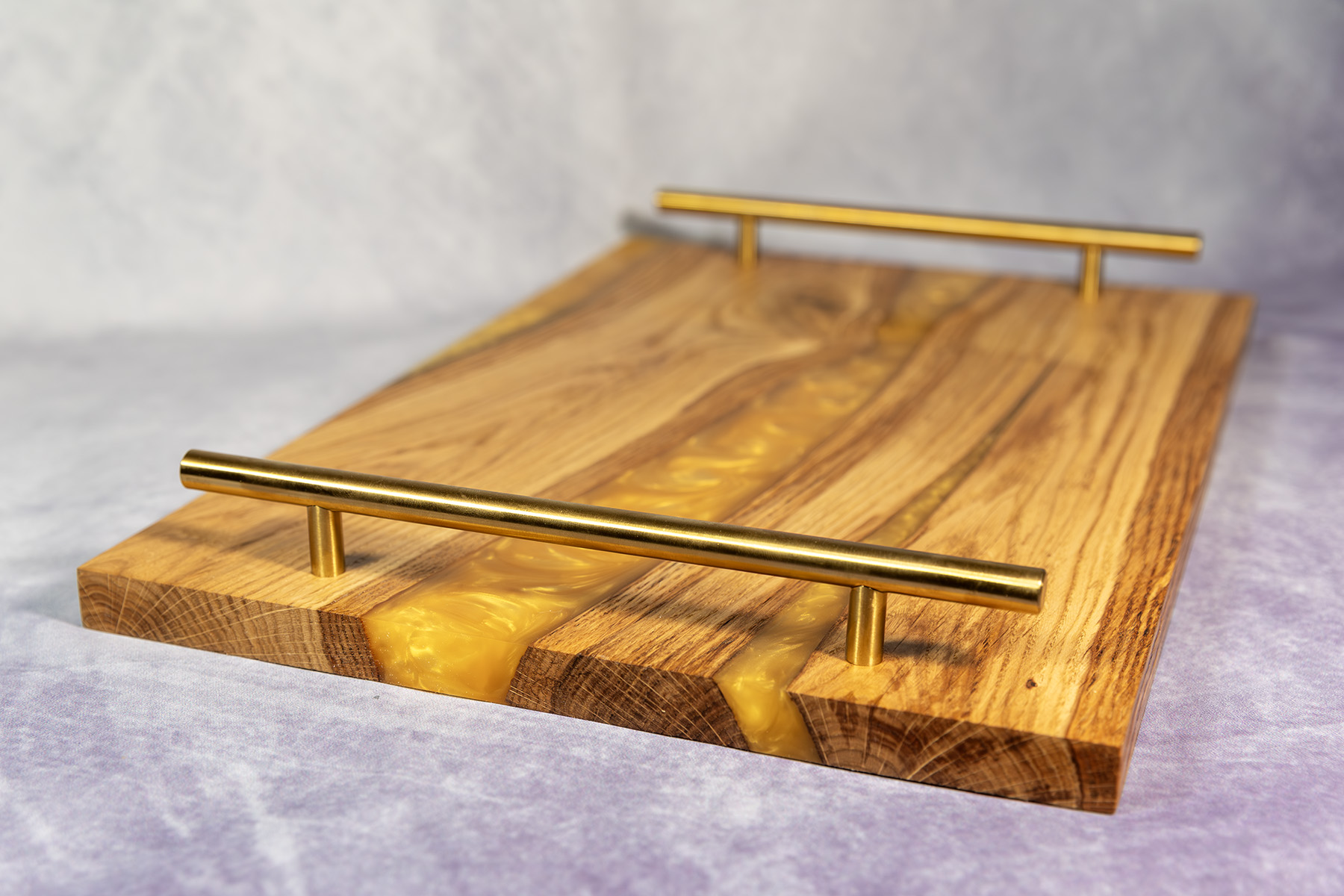 Złote, metalowe uchwyty o długości 25 cm i średnicy 10 mm nadają całości luksusowego charakteru, zapewniając wygodne i stabilne przenoszenie. Subtelny połysk metalu pięknie kontrastuje z naturalnym ciepłem dębu i głębią koloru żywicy.