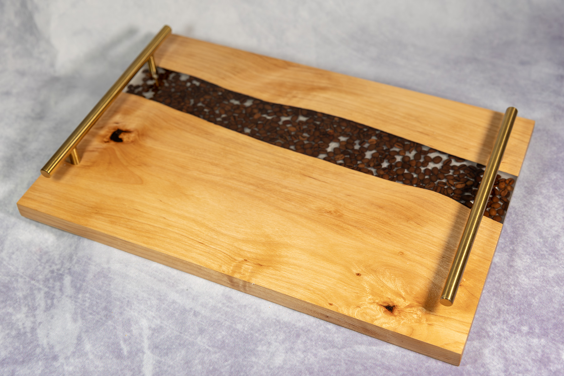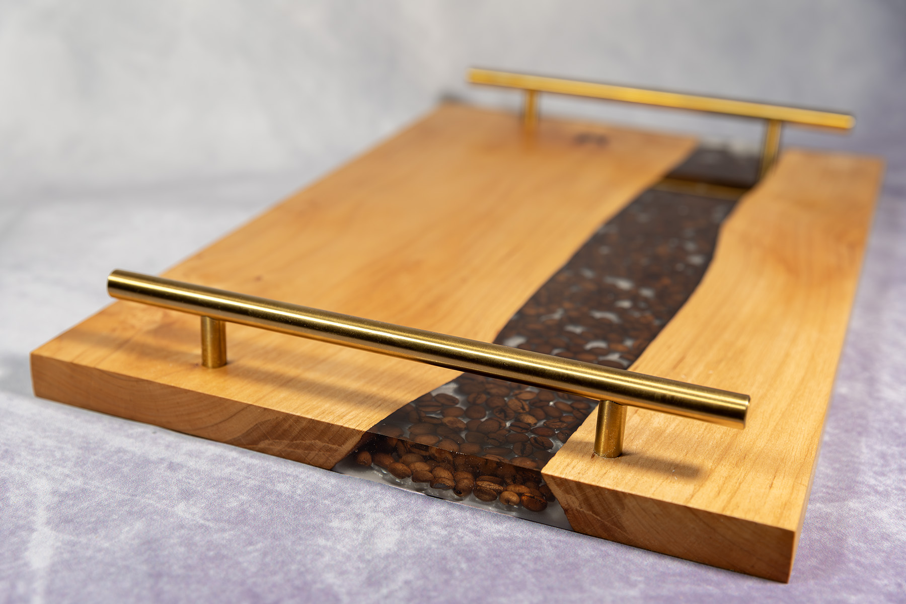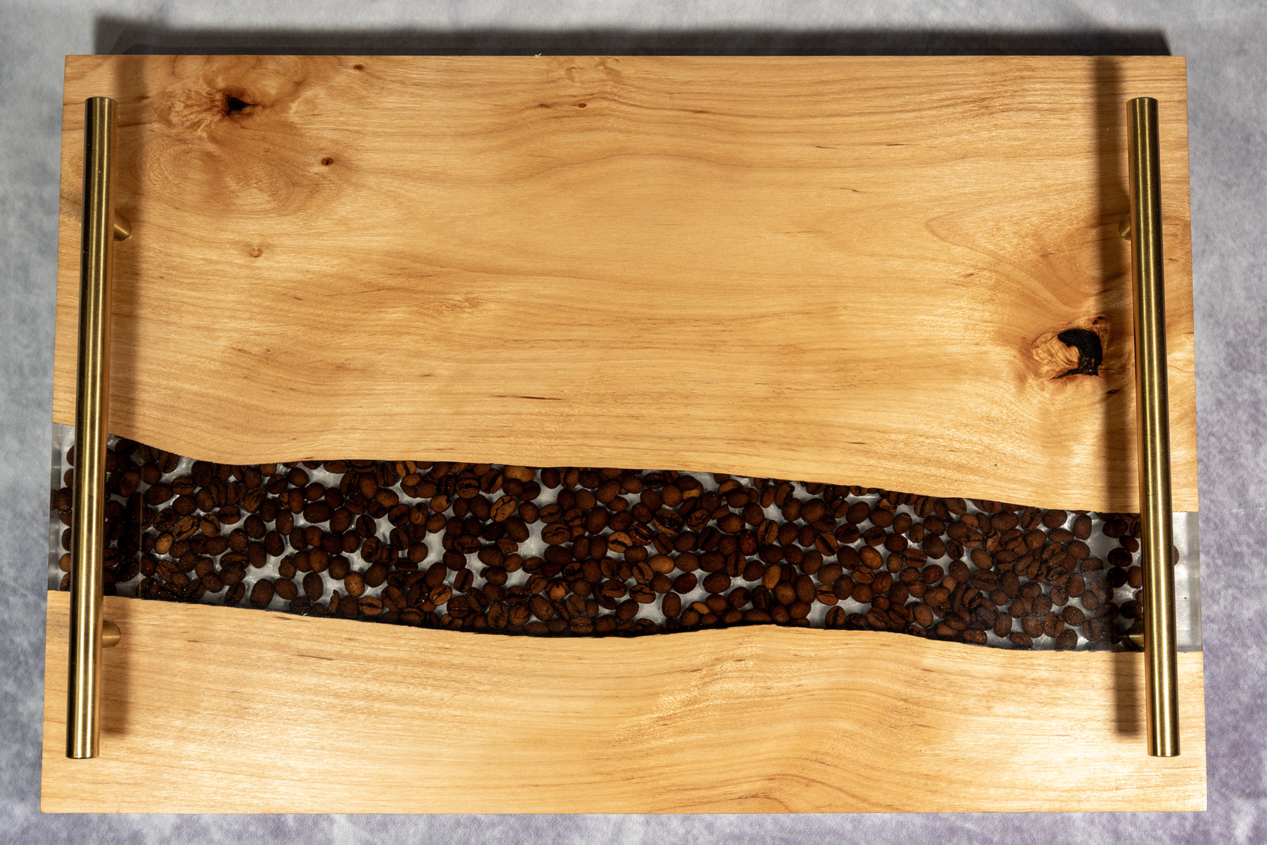 - Uchwyty: metalowe, długość 25 cm, wysokość 3 cm, średnica 10 mm • Materiały: lite drewno dębowe, najwyższej jakości żywica epoksydowa, ziarna kawy naturalnej – palonej, naturalny olej i wosk bez chemicznych dodatków