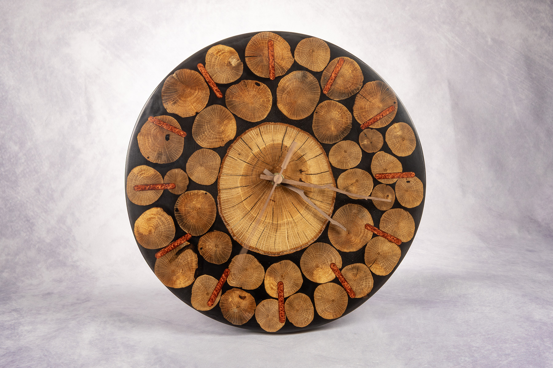 To nie tylko czasomierz, lecz dekoracyjny element natury – fragment drzewa zamknięty w nowoczesnej formie.