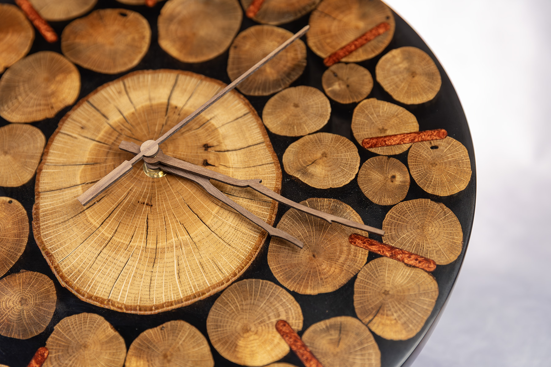 Naturalna historia zapisana w słojach drewna. Ten wyjątkowy zegar powstał z ręcznie dobranych plastrów litego dębu zatopionych w głębokiej, kontrastującej żywicy epoksydowej. Każdy element zachowuje swój indywidualny rysunek – widoczne pierścienie przyrostu, drobne spękania i naturalne detale tworzą kompozycję przypominającą przekrój pnia drzewa zatrzymany w czasie.