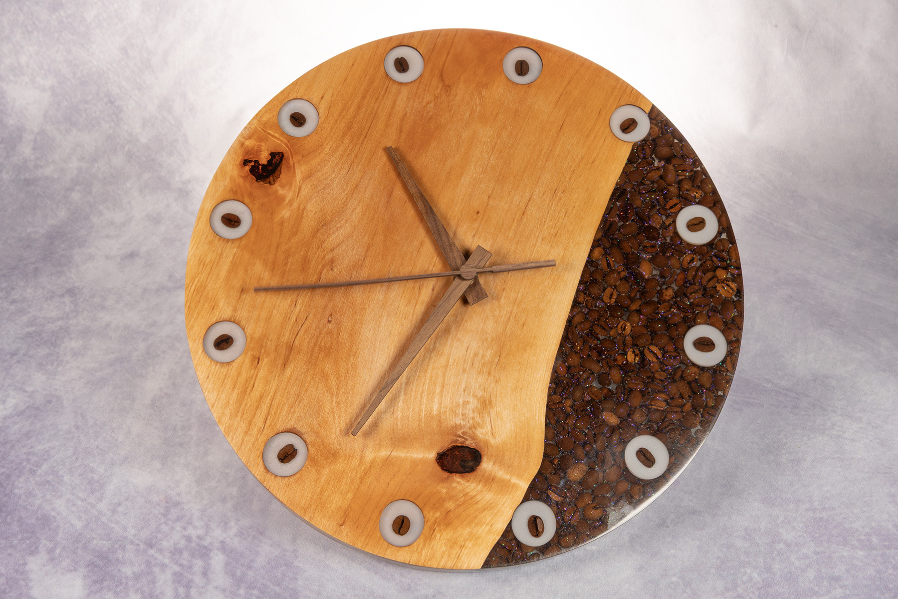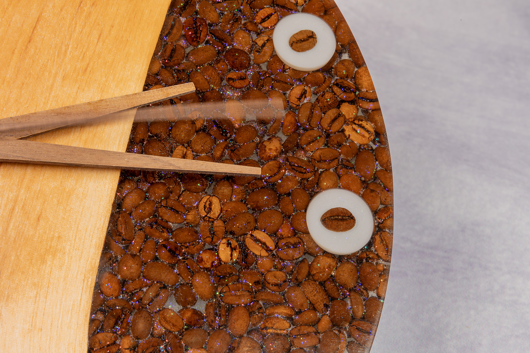 Powierzchnia została starannie wyszlifowana i zabezpieczona, co podkreśla naturalne piękno drewna olchowego oraz klarowność żywicy. Każdy egzemplarz powstaje ręcznie – układ słojów oraz rozmieszczenie ziaren kawy sprawiają, że każdy zegar jest absolutnie unikatowy.